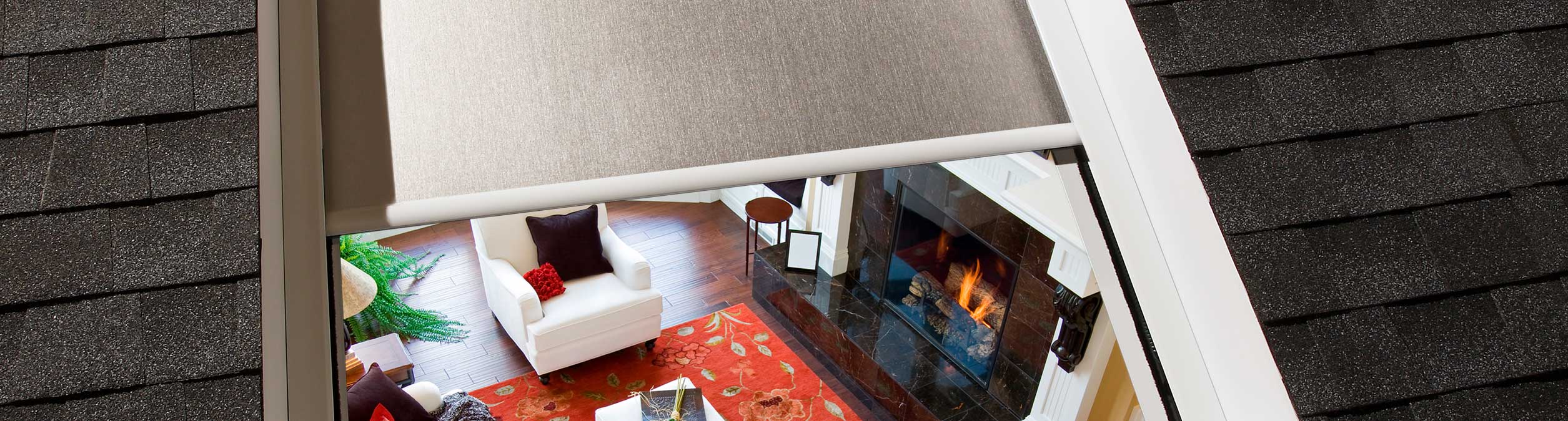 Automated roller shade for skylights and angled windows.